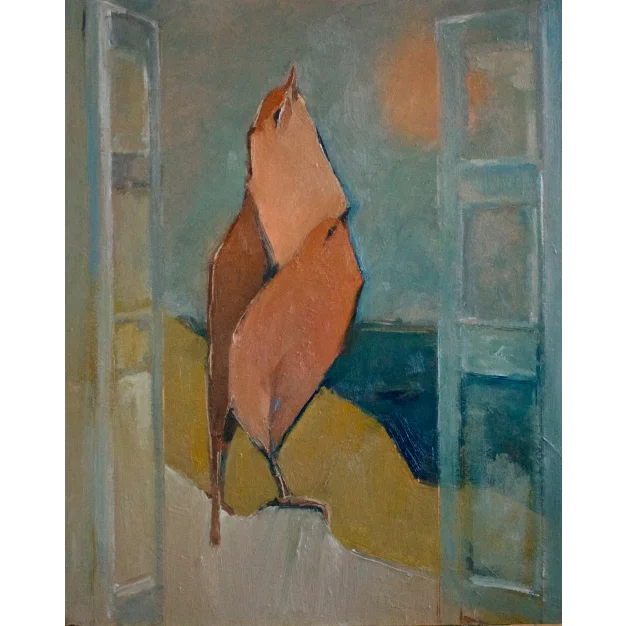 Nature awakens, and the birds herald the start of a brand new day in "Réveil matinal". This original oil painting captures a sunny morning scene through an open window, where two birds perch side by side, ready to greet the world with their wake-up song. The artist's contemporary style blends realism with abstract elements, creating a fresh and unique perspective.